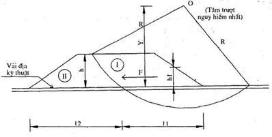 a) Khi bố trí vải địa kỹ thuật giữa lớp đất yếu và nền đắp (hình III.2) thì ma sát giữa đất đắp và mặt trên của vải địa kỹ thuật sẽ tạo ra một lực giữ khối trượt F (bỏ qua ma sát giữa đất yếu và mặt dưới của vải) và nhờ đó mức độ ổn định của nền đắp trên đất yếu được tăng lên.