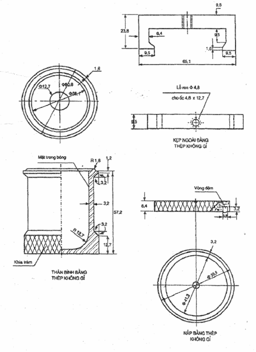 4.7. Bình phản ứng bằng thép không gỉ hoặc bằng polyetylen (không bị biến dạng và không phản ứng với hóa chất thử nghiệm ở 80oC). Bình có dung tích 75 ÷ 100 ml và có nắp đậy giữ kín khí (xem hình 1).