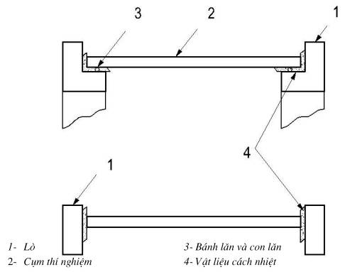 7.2.1.1. Các điều kiện tiêu chuẩn ( sàn tựa trên các con lăn) được nêu trong điều 7.2.1.2 và 7.2.1.3. Cách bố trí sàn tựa đơn giản đặt trong lò theo hình 1.