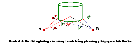 5.5.4     Nếu không có máy toàn đạc điện tử có chế độ đo trực tiếp bằng LASER thì có thể sử dụng máy toàn đạc điện tử thông thường nhưng trong trường hợp này tại các điểm Aivà Bij cần phải dán các gương giấy chuyên dùng.  Trình tự đo và tính các yếu tố đặc trưng cho độ nghiêng của công trình tương tự như trong  mục 5.5.3.